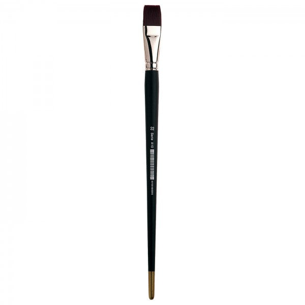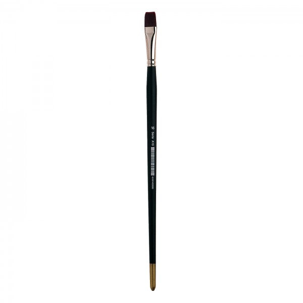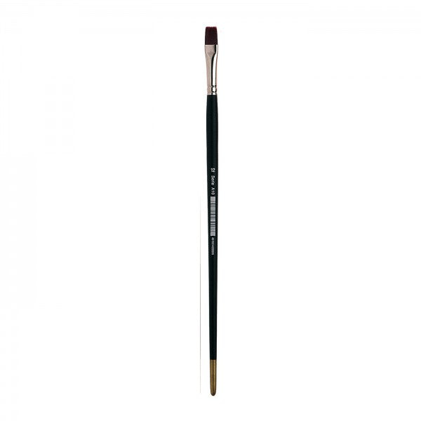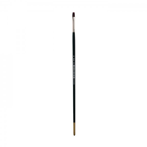 Flache Künstlerpinsel mit weinrotem Synthetikhaar in einer nahtlosen, silberfarbenen Zwinge, mit langen, mattschwarzen Stielen. Geeignet für Öl-, Acryl- und Gouachemalerei.