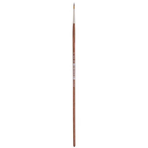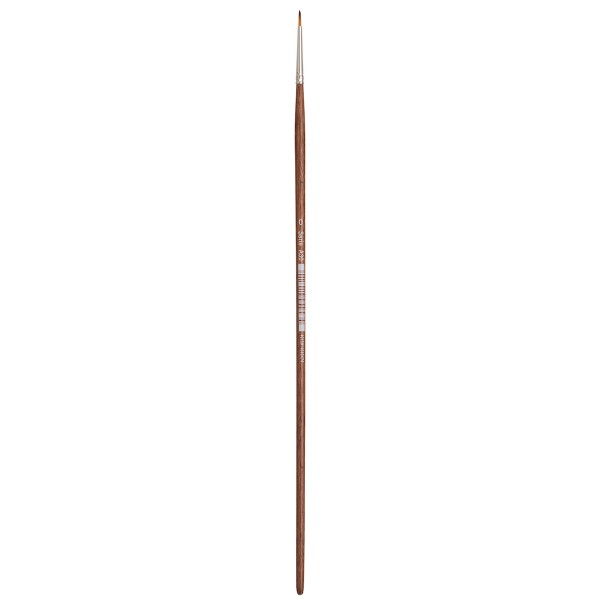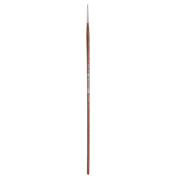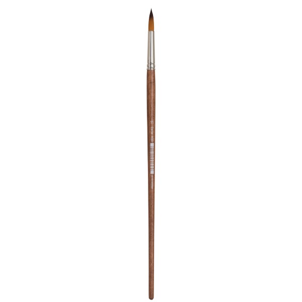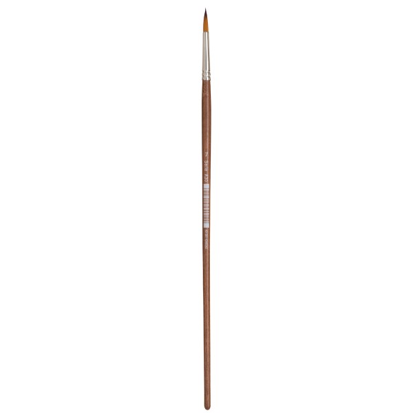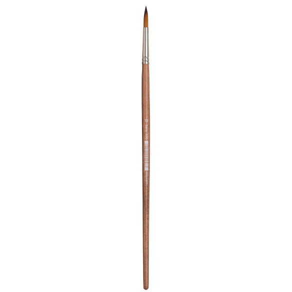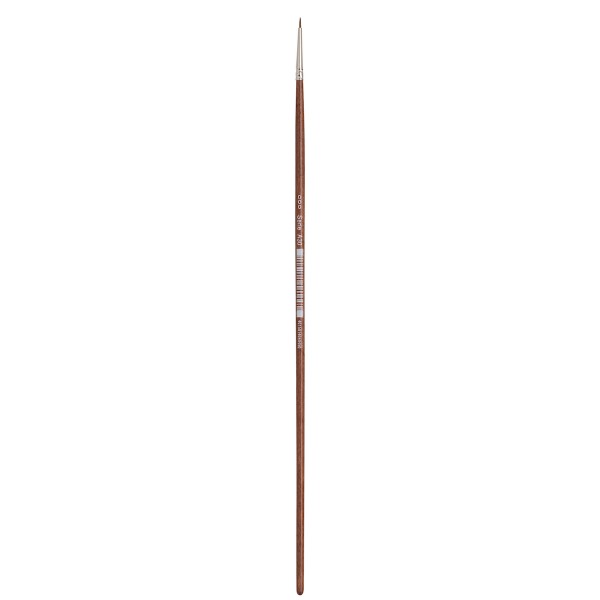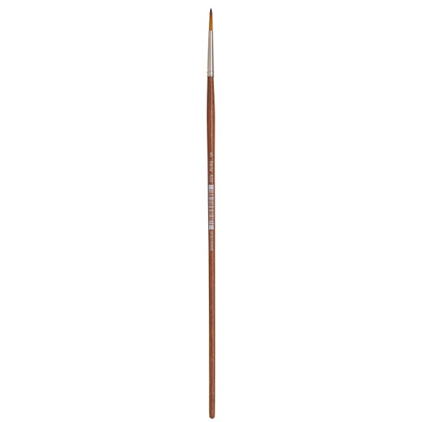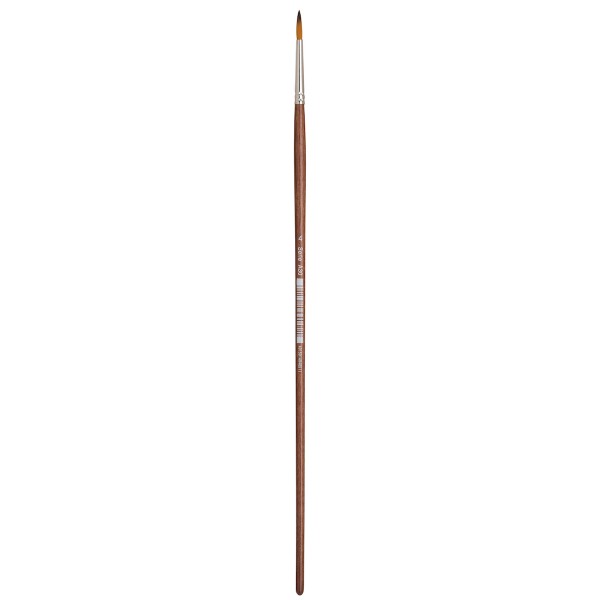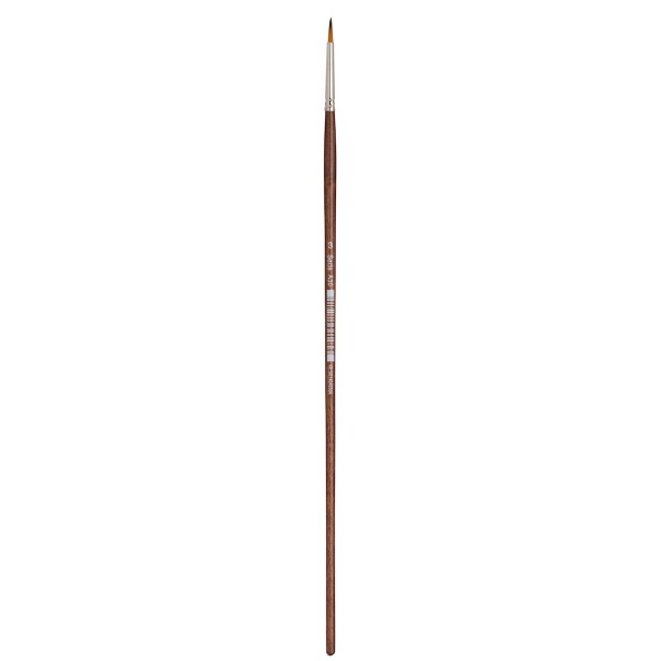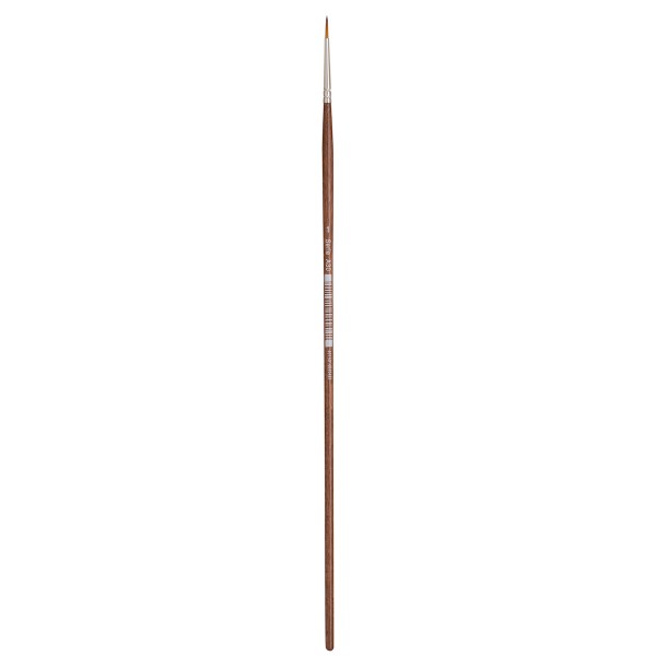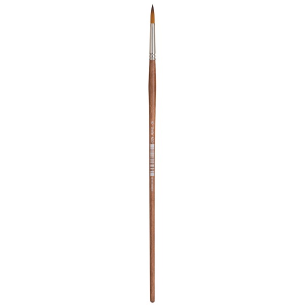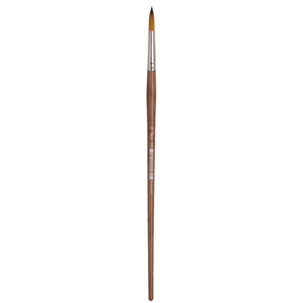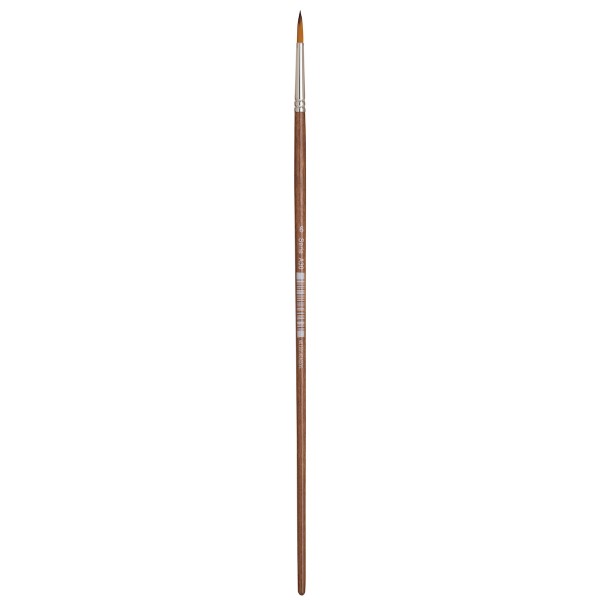 breiter, runder Künstlerpinsel mit feinem, zweifarbigen Synthetikhaar in einer nahtlosen, silberfarbenen Zwinge, mit langem, braun lasiertem Stiel. Geeignet für Acryl-, Öl- und Gouachemalerei.