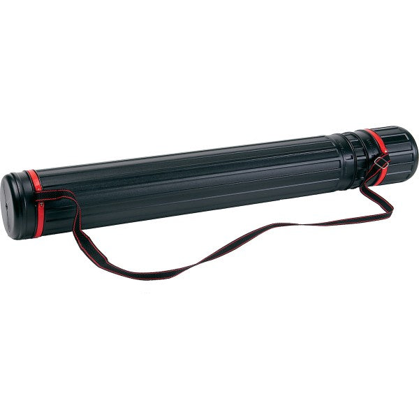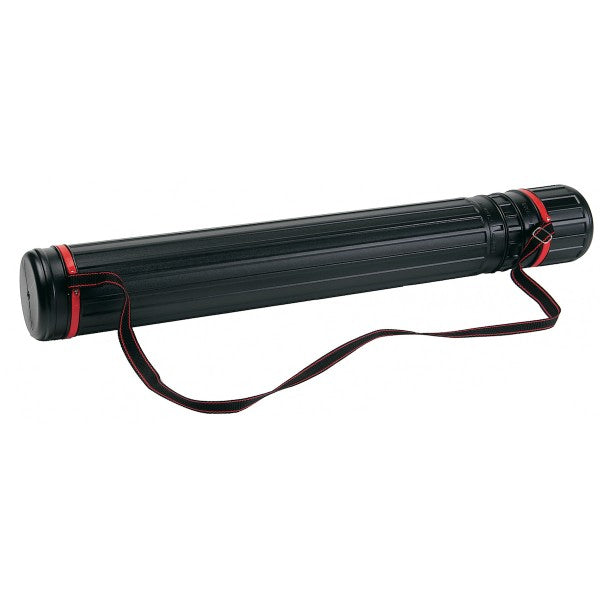 Schwarze, teleskopartig verlängerbare Kunststoffrolle (PE) mit schraubbarem Verschlußdeckel und verstellbarem Schultergurt.