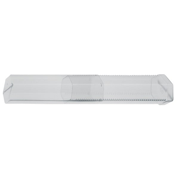 Transparente Kunststoffhülse mit einem Raster zur Längeneinstellung. Die sechskantige Form verhindert das Hin- und Herrollen und ermöglicht das Stapeln mehrerer Hülsen.