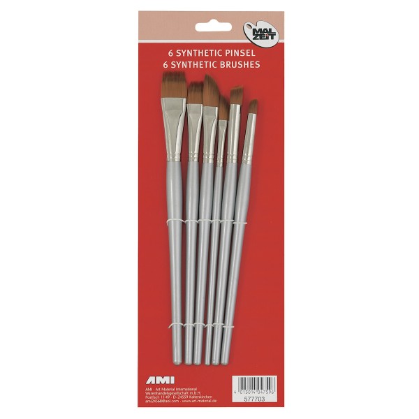 6-teiliges Set aus 4 Flach- und 2 Rundpinseln mit braunem Synthetikhaar, kurzen, silber lackierten Stielen und nahtlosen Silberzwingen.